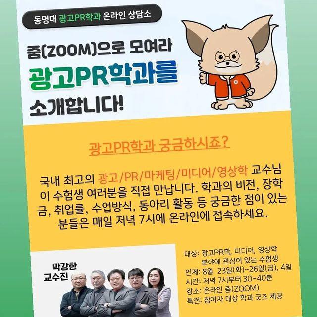 🦊 광고, PR, 마케팅, 영상, 미디어 스페셜리스트를 꿈꾸는 고3 수험생 주목! 온라인 학과 설명회 8월 23일(화)부터 26일(금)까지 4일간 오후 7시에 진행됩니