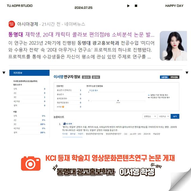 📣 4학년 이서영 학생이 한국연구재단 등재학술지 <영상문화콘텐츠연구>에 짱구는 못말려 콘텐츠 이용과 캐릭터 인식, 편의점의 콜라보레이션 상품 구