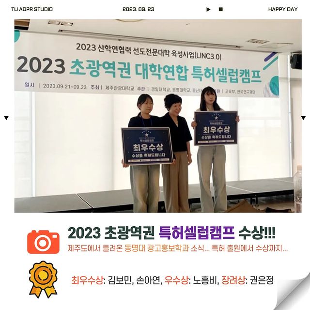 📣 축하해주세요.✨️ 제주도에서 열린 2023 초광역권 대학연합 특허셀럽캠프에서 우리 학과 학생들이 4명의 수상자를 배출했어요.🏆 최우수상을 받은 김