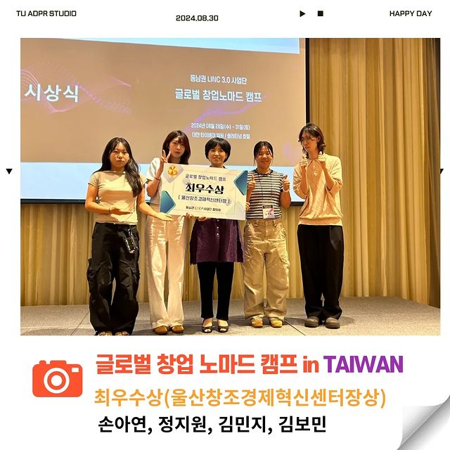 📣 축하합니다.! 대만 타이베이에서 개최된 글로벌 창업 노마드 캠프에서 2학년 손아연, 정지원, 3학년 김민지, 김보민 학생이 최우수상(울산창조경제혁
