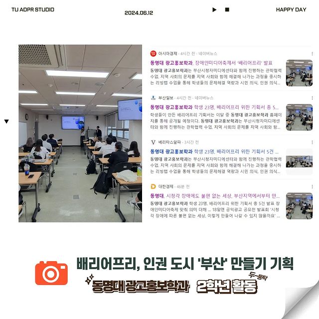 📣 제18회 장애인미디어축제에 광고홍보학과 2학년 학생들이 참여했어요. 우리 학생들은 부산시청자미디어센터에서 부산 지역 배리어프리 환경 조성