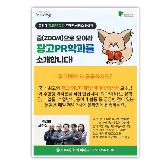 🦊 광고, PR, 온라인 마케팅, 영상, 미디어 스페셜리스트를 꿈꾸는 고3 수험생 주목 📣 6-8차 온라인 학과 설명회를 9월 6(화)부터 8일(목)까지 3일간 오후 7