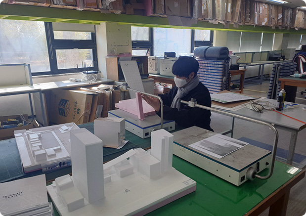 학년별 통합 건축 STUDIO 실습실과 레이저 커터 등 모형제작기구를 갖춘 조형 실습실이 있으며, 실사 출력 가능한 플로터를 구비하고 있습니다. 평면과 3D 작업을 할 수 있는 컴퓨터 실습실이 있으며, BIM 사업단 참여로 REVIT, ArchiCAD 등 대부분의 BIM 소프트웨어를 보유하여 수업에 활용하고 있습니다.