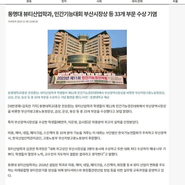 동명대 ‘민간기능대회’ 부산시장상 등 33개 부문 수상(부산일보)