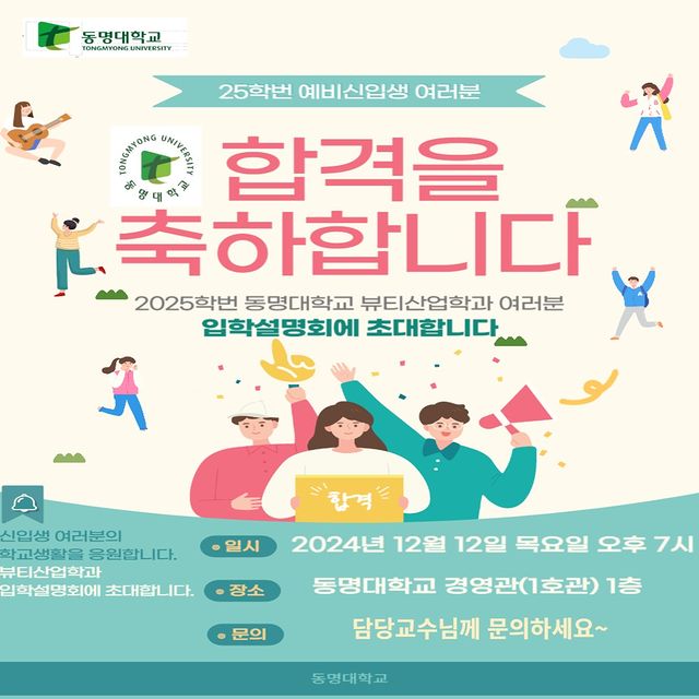동명대학교 뷰티산업학과 25학번 신입생 여러분을 환영합니다. 축하합니다 합격!!!