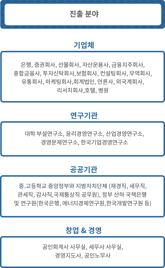 - 중·고등학교 중앙정부와 지방자치단체(재경직, 세무직, 관세직, 감사직, 국제통상직 공무원), 정부 산하 국책은행 및 연구원 (한국은행, 에너지경제연구원, 한국개발연구원 등)