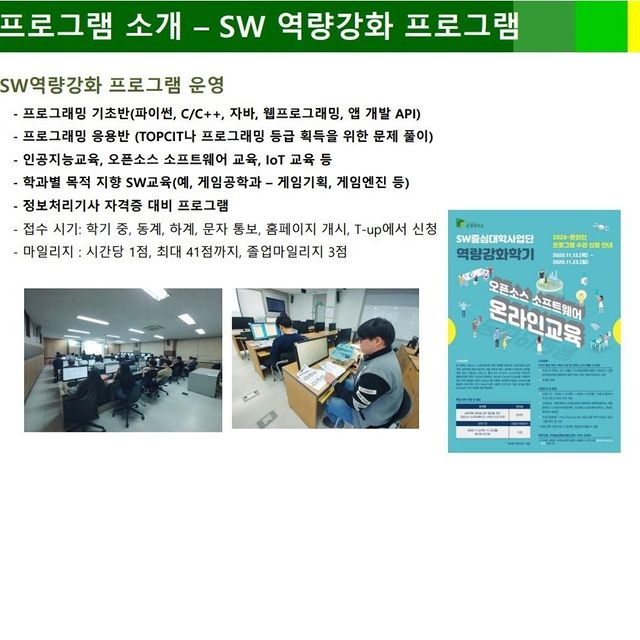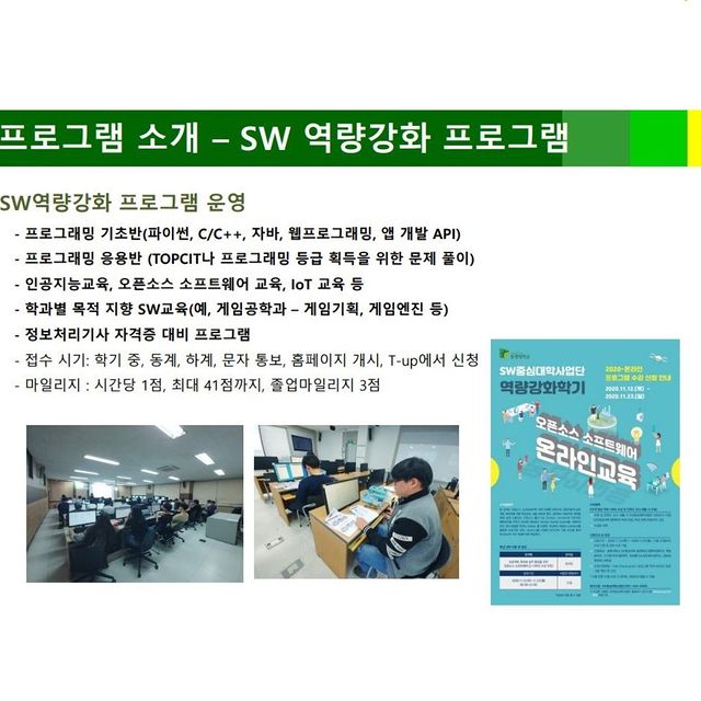 computer_tu 동명대 컴퓨터공학과는 SW 중심대학 사업에 참여하고 있으며 다양한 컴퓨터 프로그램을 교육하고 있습니다.