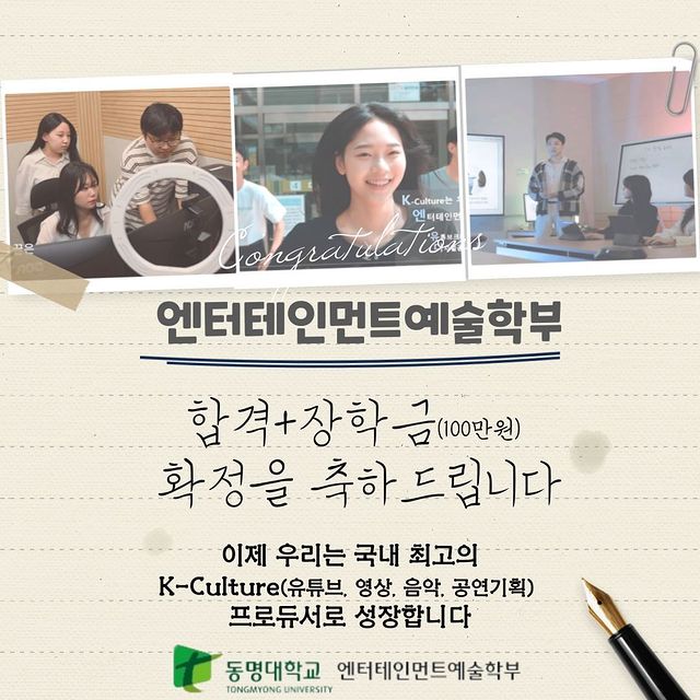 엔터테인먼트예술학부 합격 확정한 학생 여러분 진심으로 축하하고 환영합니다! 🌷 이제 우리 대학에서 여러분이 한국을 대표하는 K-Culture 프로듀서로 성장할 수 있도록 최선을 다해 돕겠습니다~!! #K-Culture #부산광역시 #동명대학교 #엔터테인먼트 #문화예술 #방송연예 #KPop #실용음악 #1인미디어 #프로듀싱 #유튜브크리에이터 #디지털공연예술 #엔터테인먼트예술학부