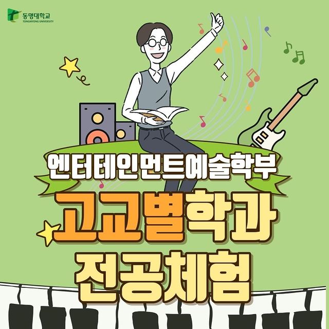 엔터테인먼트예술학부가 궁금해?! 예비 24학번 모여라! 동명대 엔터테인먼트예술학부로 초대합니다. 원데이 캠퍼스(캠퍼스&스튜디오 투어)에 참여할 학생은 주저없이 신청하세요~! 운영기간 10월4일~6일(동명대 축제기간 with Zion.T브브걸주호), 10월 13일, 20일, 27일(매주 금요일 16시 부터) 내용 맛있는 간식타임과 함께하는 전공 체험(유튜브 크리에이터, 디지털 공연예술) 교수님과 함께하는 진로 설계 및 스튜디오 투어 문의 및 신청 https//www.tu.ac.kr/codi/index.do (동명대 엔터테인먼트예술학부 홈페이지) 051-629-2623 #K-Culture #부산광역시 #동명대학교 #엔터테인먼트 #문화예술 #방송연예 #KPop #실용음악 #1인미디어 #프.......