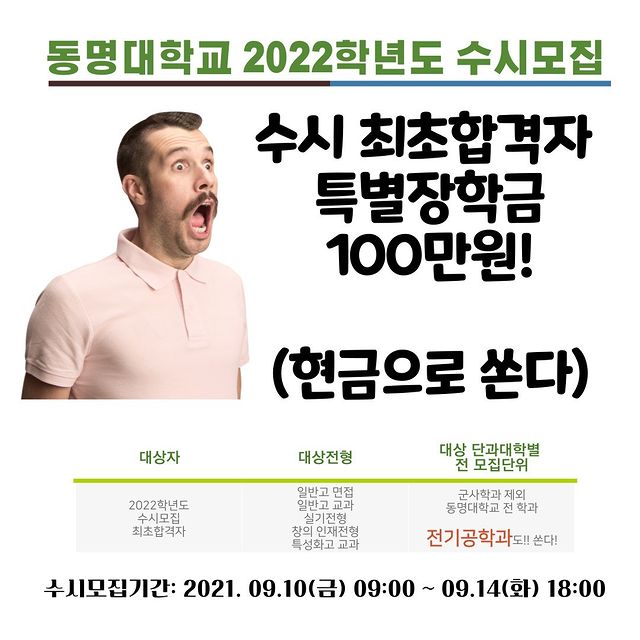 동명대학교 2022학년도 수시모집 최초합격자 특별장학금 100만원 지급! 우와!!! 동명대학교 전기공학과에 와서 장학금도 받고 신나는 공부도 하자!! #행