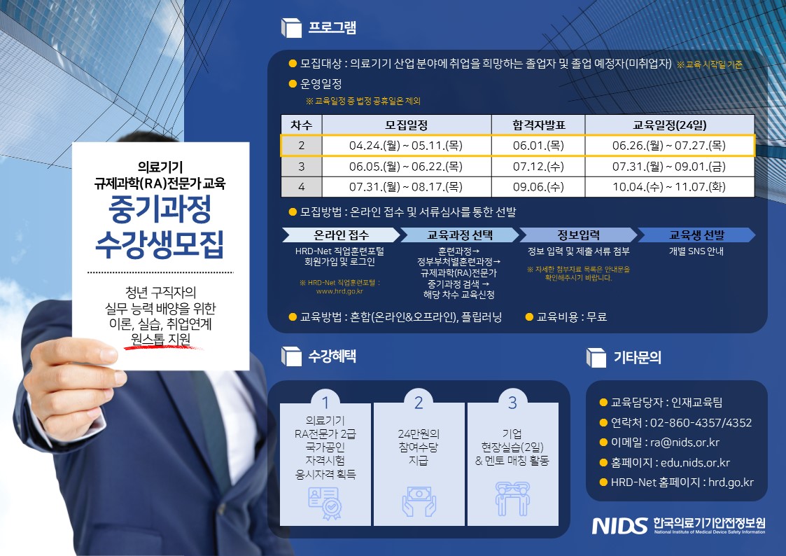 고용노동부 일자리 지원 사업 「의료기기 규제과학(RA)전문가 교육 중기과정(2차)」 교육생 모집 안내드립니다.