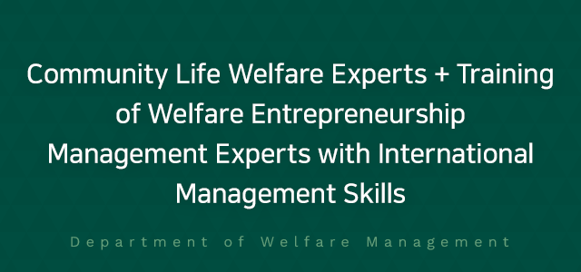 Development of human resources specializing in welfare management, which is responsible for promoting the ecosystem of welfare start-ups, leading the shared growth of the region. We develop start-up management capabilities that understand policy trends, businesses, and future demands based on a comprehensive understanding of welfare through learning in welfare fields such as children, adolescents, adults, senior citizens, and families. In particular, the program combines adult learners' know-how and knowledge to cope with changes in future industries due to low birth rate and aging to cultivate a major role in revitalizing the region. We will also promote the welfare management ecosystem and train local start-up experts to lead the future society based on field practice experience of social welfare institutions, senior welfare institutions, and youth institutions.