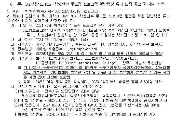 2024학년도 KUSF 학생선수 두드림 프로그램 일반학생 튜터 모집 공고 및 게시 시행