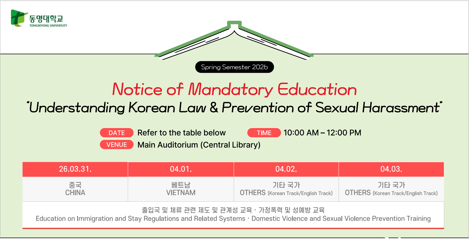 This program is a mandatory education required by the Korean Ministry of Education to support international students’ understanding of Korean laws and adaptation to life in Korea.