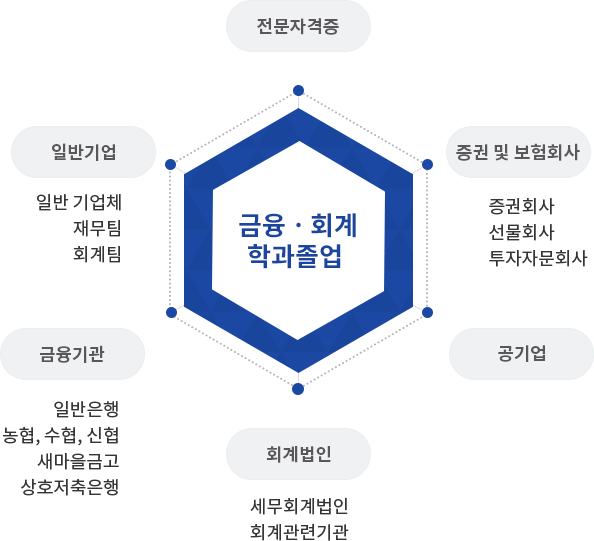 금융·회계학과는 재무·금융·회계·세무분야 인재의 사회적 수요 증가로 인해 다양한 진로가 열려 있습니다. 또한 부산지방국세청, 부산지방세무사회와 연계한 실무중심의 교육을 통해 재무·회계 및 세무분야의 전문가를 양성하여 기업체의 재무·회계부서 및 회계법인으로의 진로가 열려있습니다.
