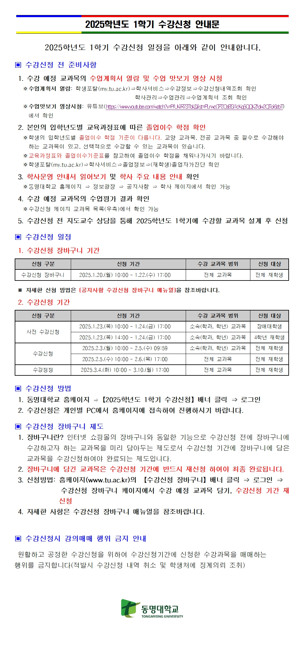 2025학년도 1학기 수강신청 안내