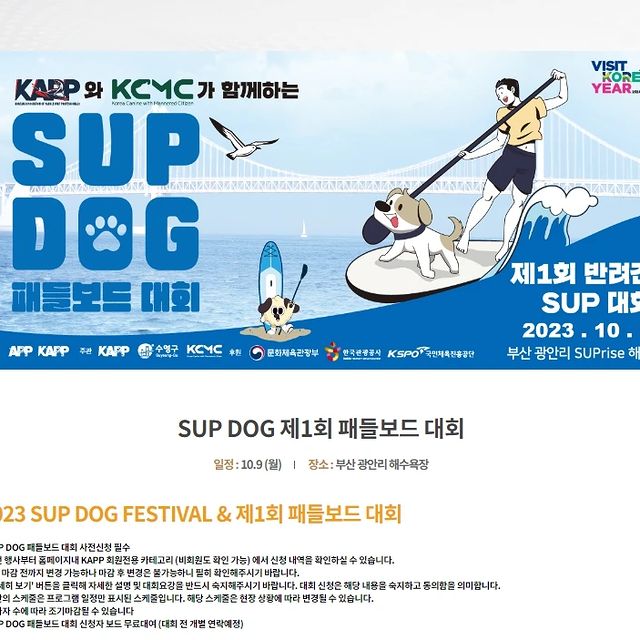 WOW~ 반려견 SUP대회가 개최 됩니다!! 부산하면 바다! 바다하면 보드! 이제는 반려동물도 부산입니다. ^^ 많이 기대되는 행사입니다.