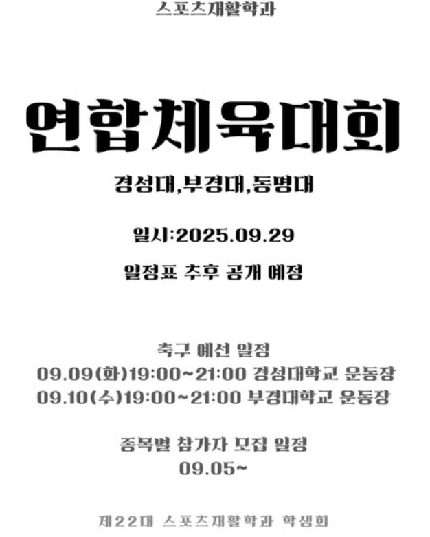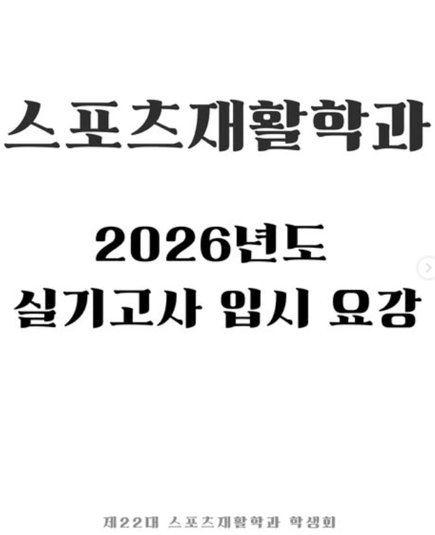 • 2026학년도 스포츠재활학과 실기전형 안내 1. 수시모집 기간: 2025.09.08.(월)09:00 ~ 09.12.(금)18:00 2. 실기고사: 2025.10.01.(수) 오전/오후 3. 2026학년도 입시전형: 스포츠재활학과 위주로 편집한 내용임 VIEW DETAIL